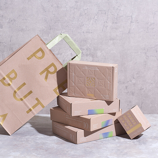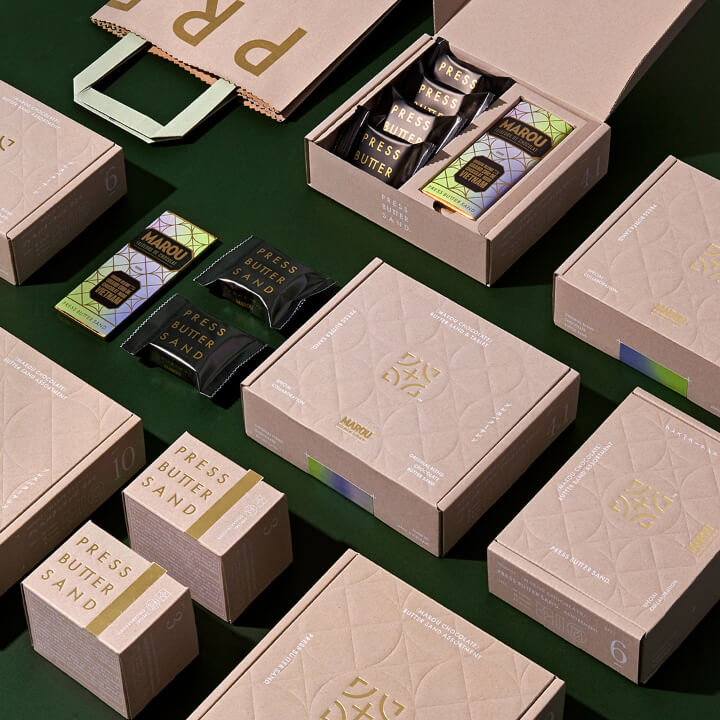 2. MAROUのチョコレートに巻かれている包装紙のデザインにインスピレーションを受け、ボックスの天面にPRESS BUTTER SANDのクッキーデザインを落とし込んだ模様の エンボス 加工がされています。