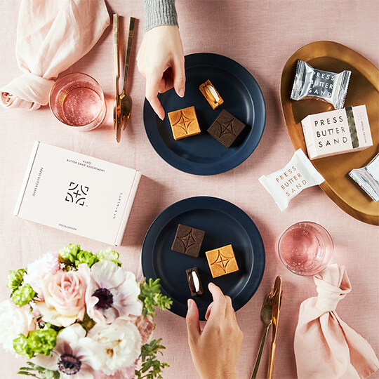 厳選されたコロンビア産のチョコレート2種を使用し、ラム酒で香り付けしたチョコレートキャラメルと口どけのよいバタークリームを、濃度の違う2種類のココアパウダーを練り込んだサクサク食感のクッキーで挟んだバターサンド〈黑〉。