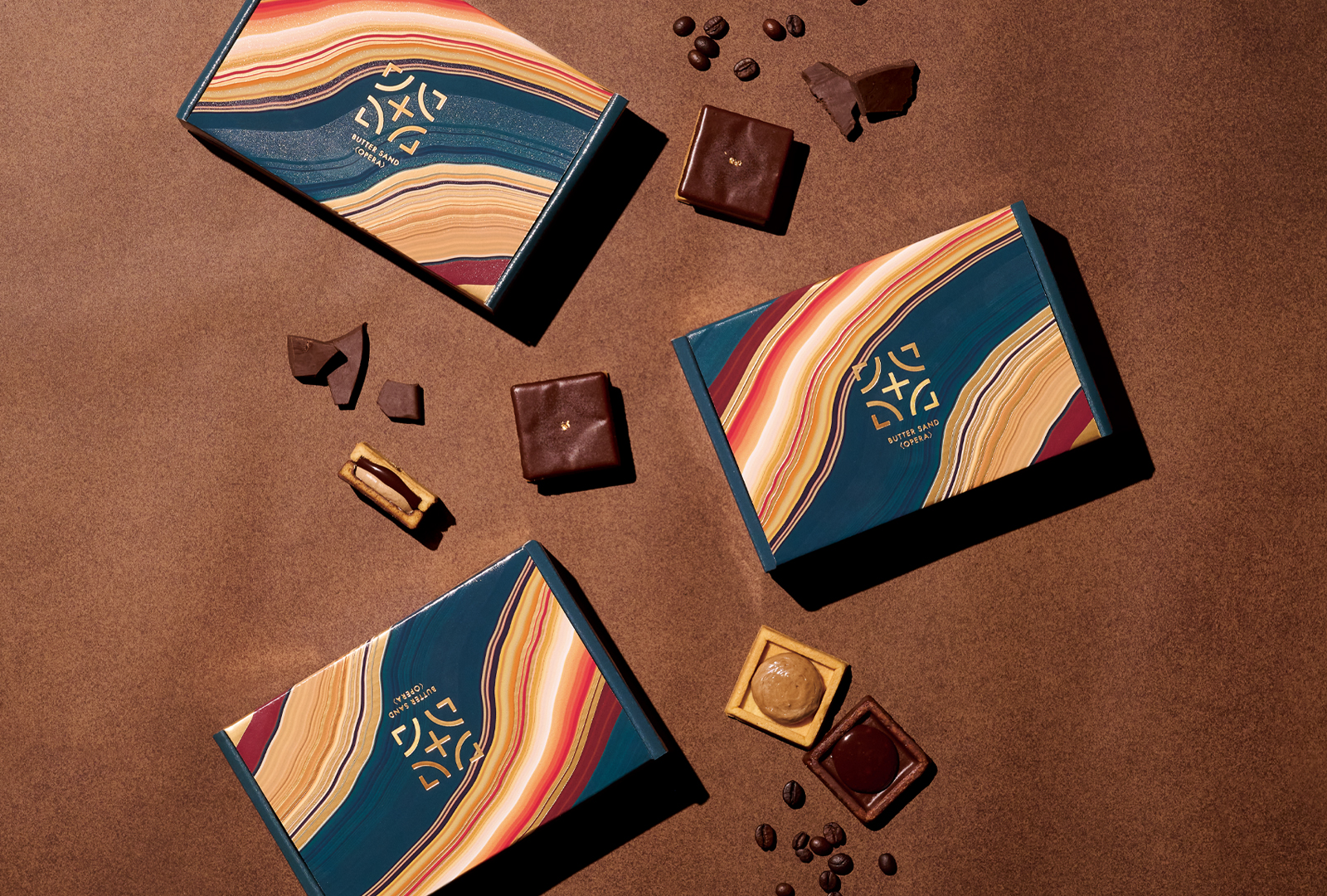 香ばしく焼き上げたアーモンドの香り豊かなクッキーで、芳醇なコーヒーバタークリームとまろやかなチョコレートキャラメルをサンド。上段のクッキーには深みのあるチョコレートをコーティングし、金箔をあしらって上品な装いに仕上げました。
