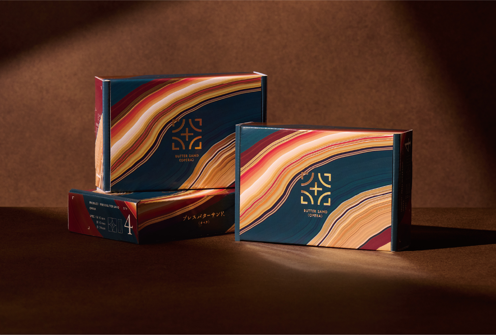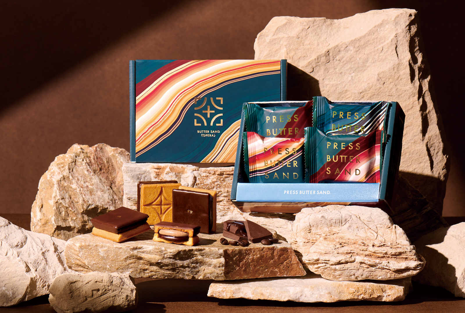 第1弾として発表する「バターサンド〈オペラ〉」は、フランスの伝統菓子“オペラ”から着想を得た、高級感あふれる新作。サクサクのバタークッキーの片側をチョコレートでコーティングし、特別な日にふさわしい贅沢感あふれるバターサンドに仕上げました。甘すぎず、チョコレートとコーヒーの余韻が広がるビターな味わいは、まさに上品な“大人の味”です。