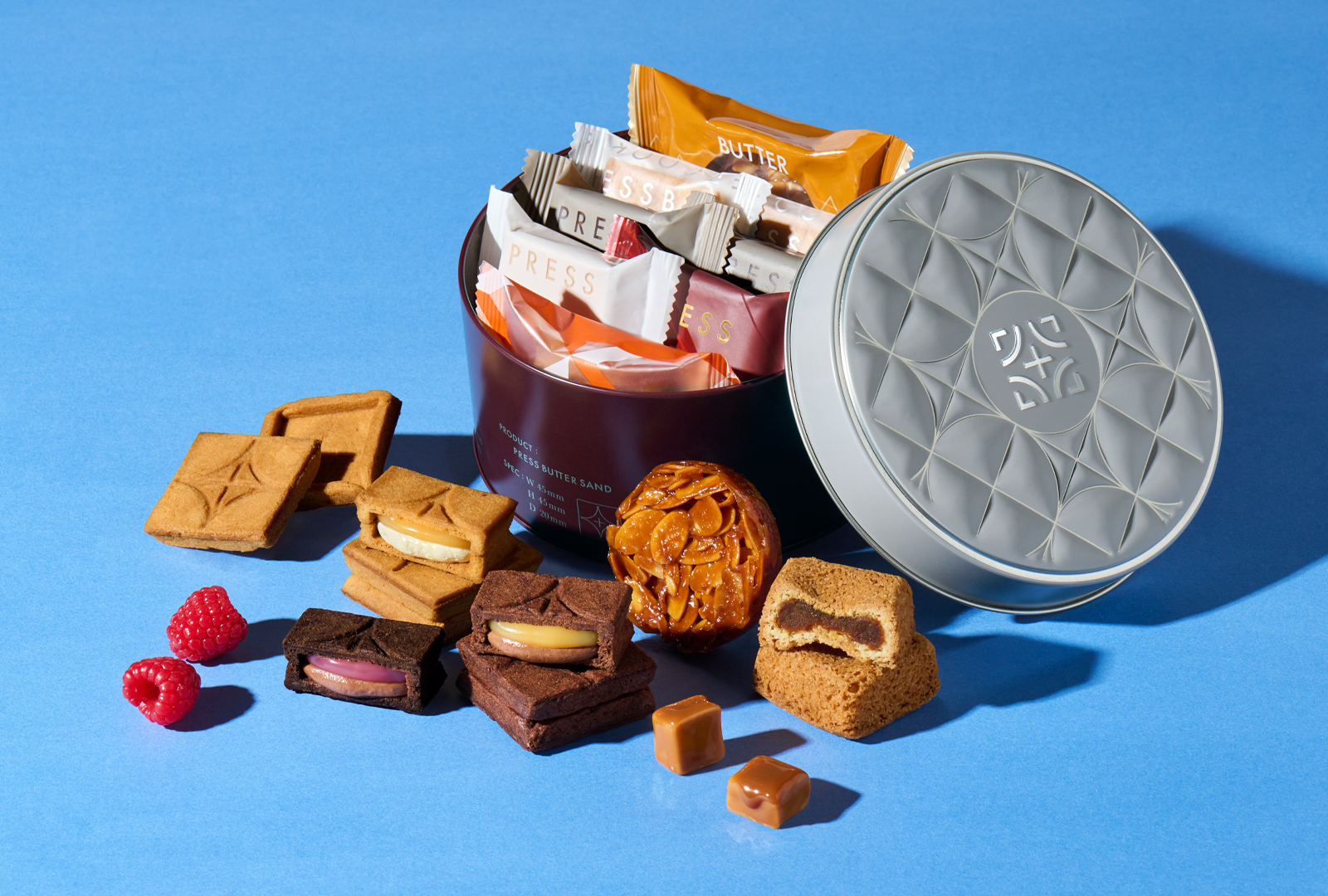 3種のバターサンドとバターフロランタン、バターサブレ〈キャラメル〉、プレスバタークッキーを「2026 アムール・デュ・ショコラ〜ショコラ大好き〜」限定のオリジナル缶に閉じ込めました。PRESS BUTTER SANDのグレーとチョコレートを想起させるブラウンの2色を基調に、蓋部分はバターサンドのシンボルマークのエンボス加工を施した、高級感のある仕様です。6つの異なる美味しさを心ゆくまで味わえる、贅沢なアソートセットをお楽しみください。