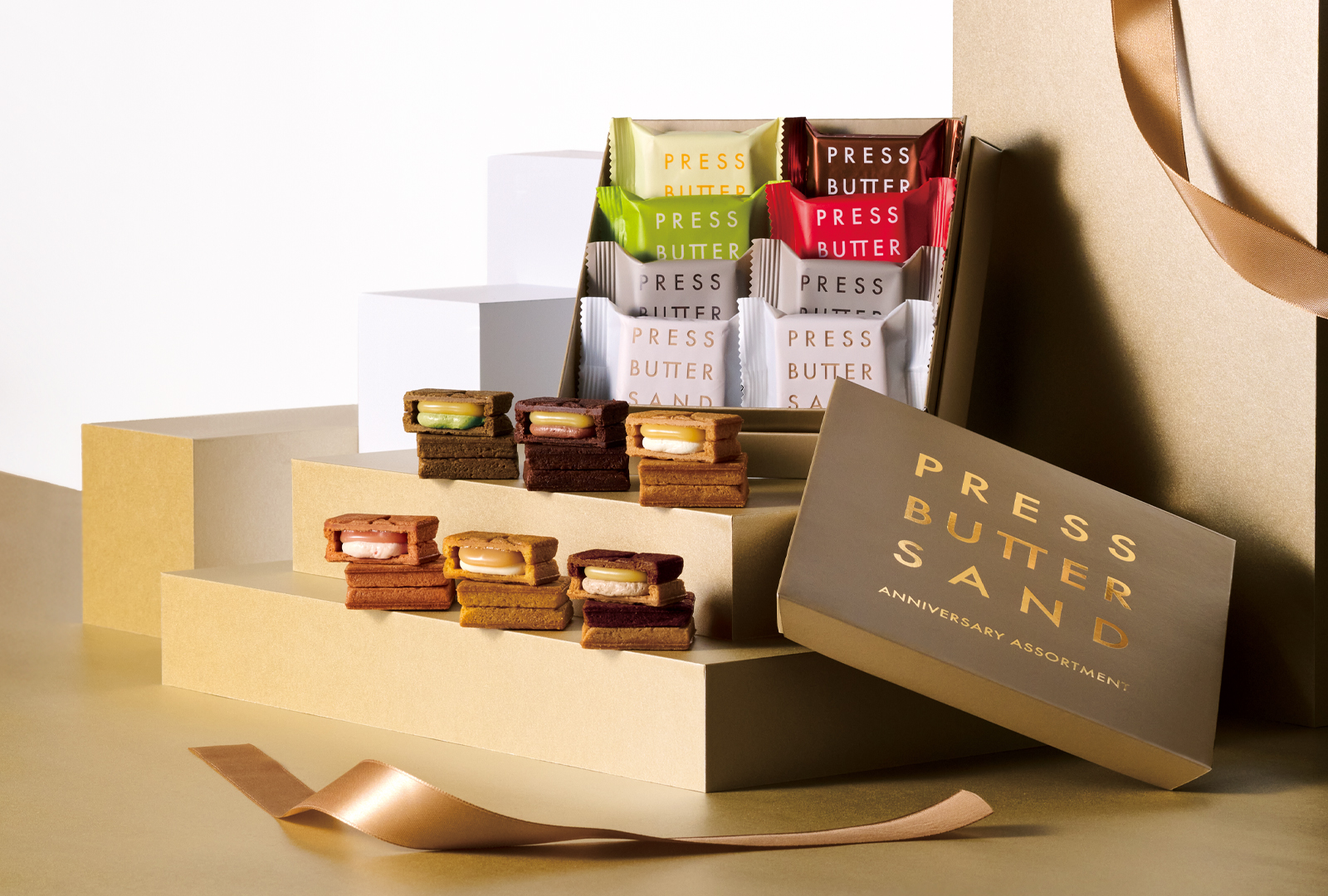 代表商品のバターサンドとバターサンド〈チョコレート〉に加え、人気のフレーバーを贅沢に詰め合わせたセットです。パッケージには、周年記念にふさわしい華やかなゴールドを配しました。