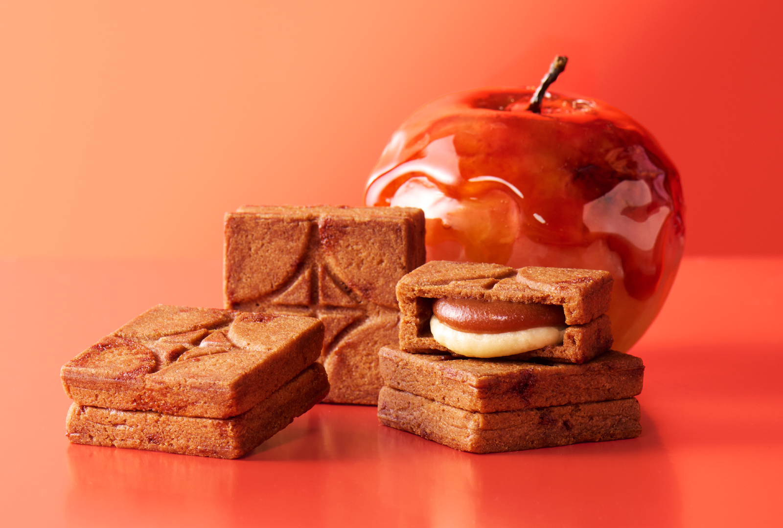 カラメルチップを練り込んだ香ばしいサクサクのクッキーで、りんごが香るビターキャラメルとカスタードバタークリームを挟みました。