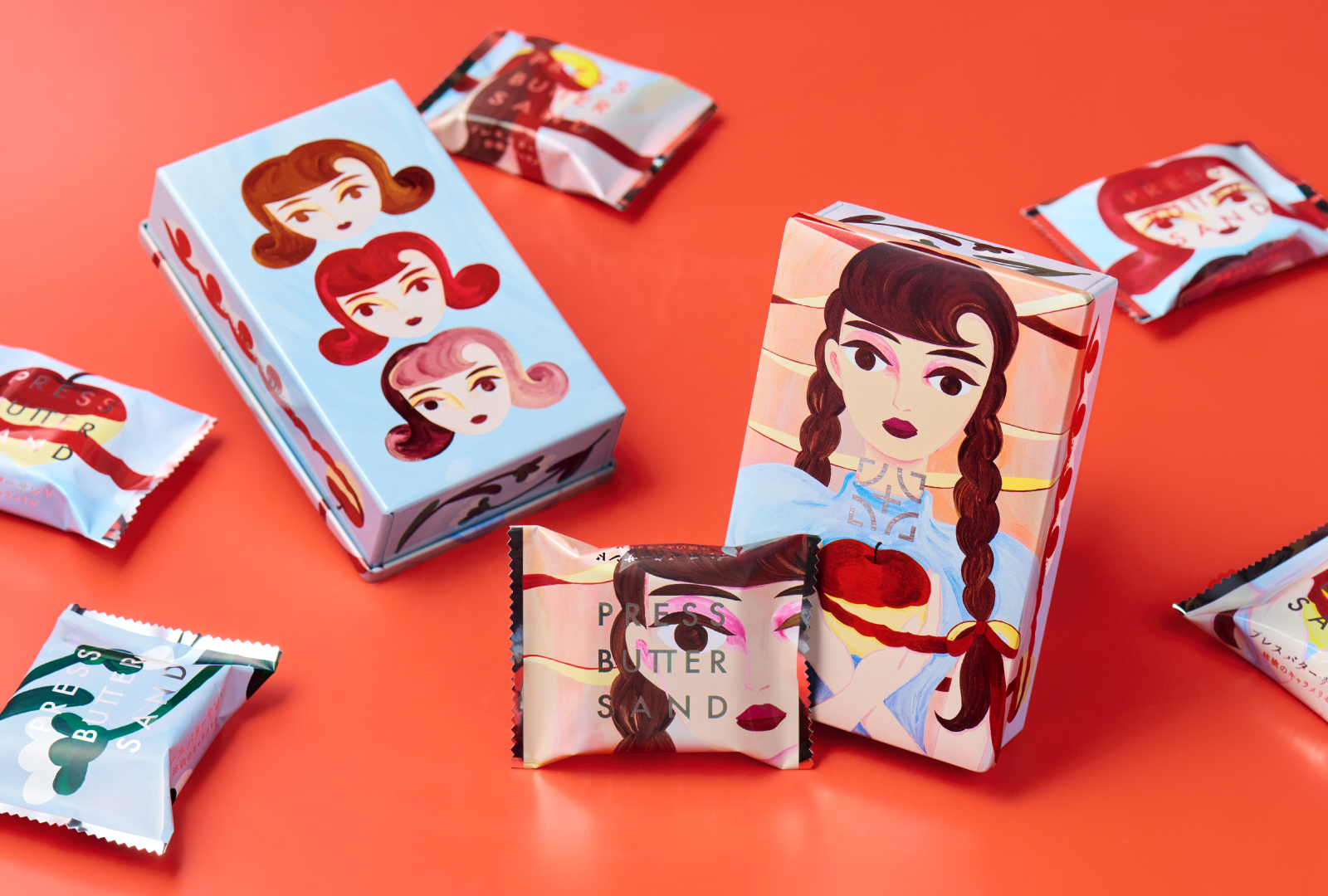 正面を真っ直ぐ見つめる女の子は、りんご・キャラメル・クリームが織りなす素材の調和を象徴しています。 手の中のりんごの皮が伸び、ビターキャラメル色の髪にリボンのように絡まる描写は、口いっぱいに広がる風味を表現。 缶の側面にはクッキーの食感やビターキャラメルのダークな味わいをイメージした遊び心あるモチーフが施され、裏側にもフレーバーをモチーフにした3人の女の子が隠れているなど、細部にまでこだわりが詰まっています。