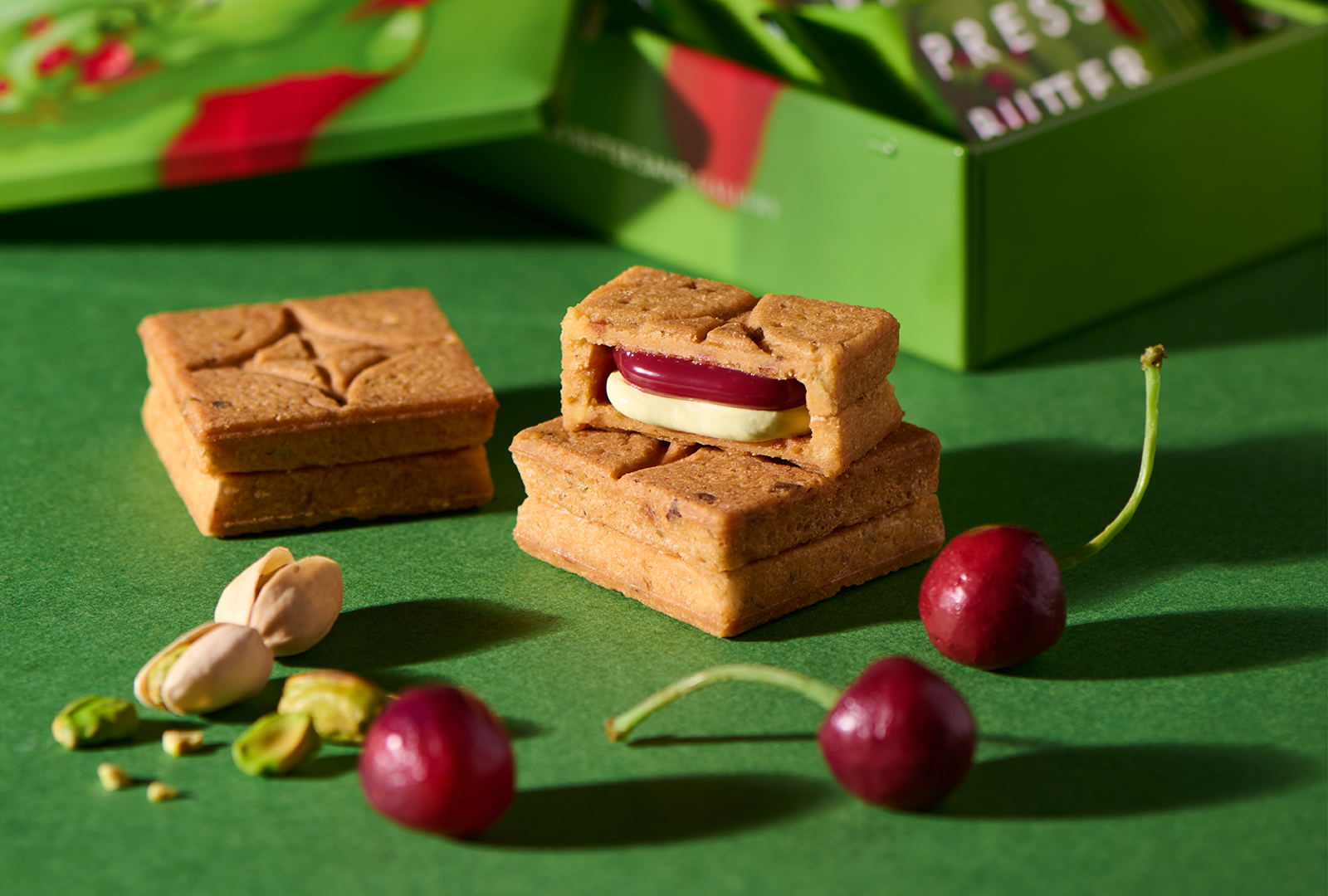 ピスタチオを練りこんだサクサクのクッキーに、香ばしいピスタチオバタークリームと、鮮やかな色合いの甘酸っぱいチェリーキャラメルをサンド。まるでケーキのような、贅沢感のあるバターサンドに仕上げました。