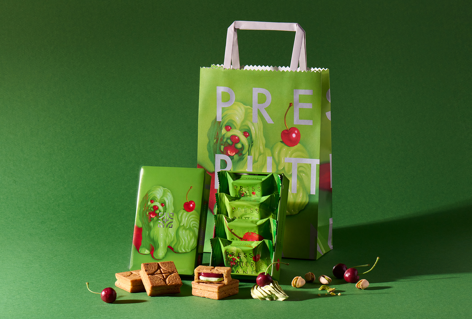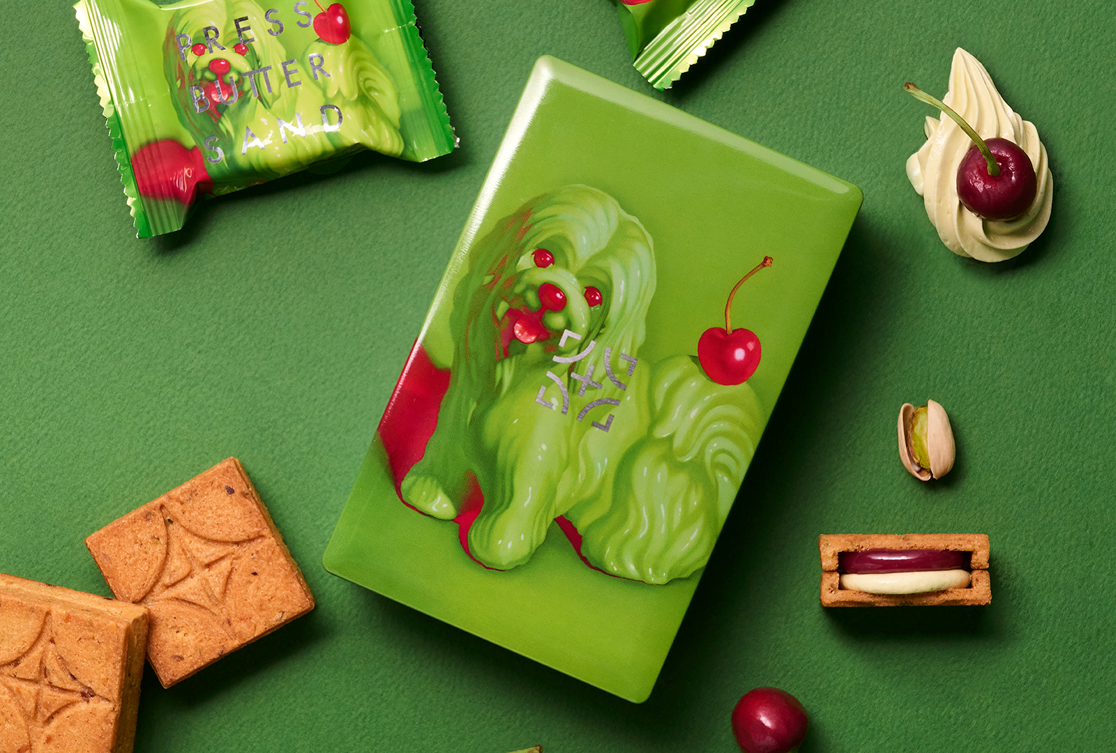 注目は、純粋無垢な表情でこちらを向く犬。クッキーにサンドされたピスタチオバタークリームをモチーフに、艶やかな質感で描かれています。味わいを直観的に伝える色として「黄緑」と「マゼンタ」を主役のカラーとし、味わいそのものを表現したアート作品です。