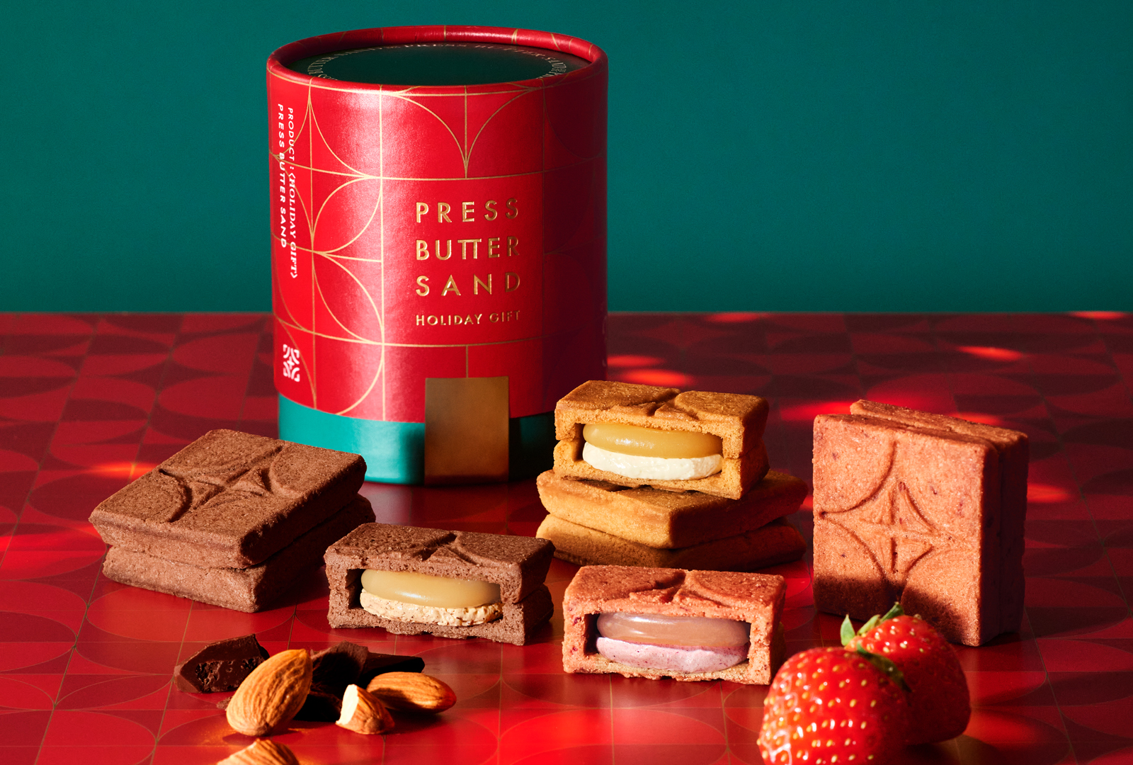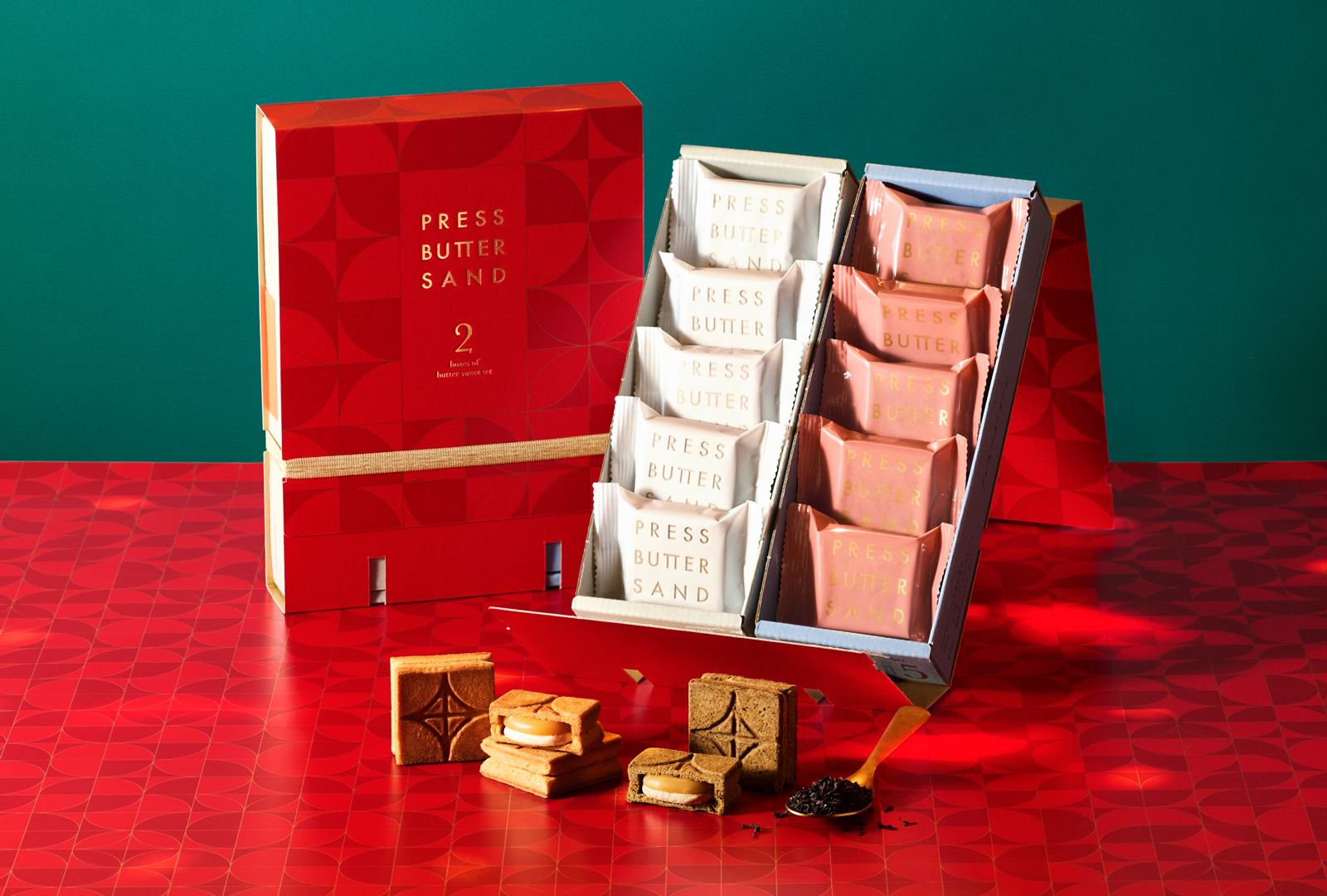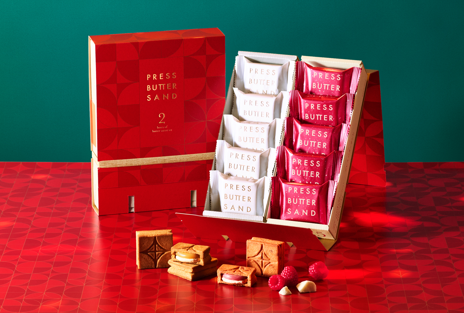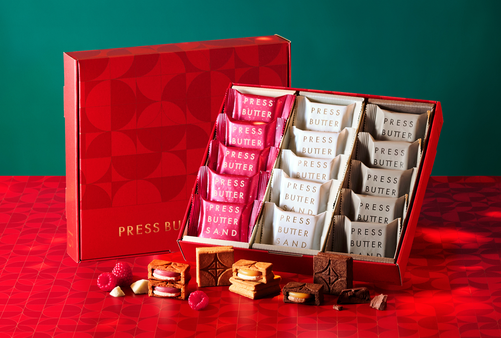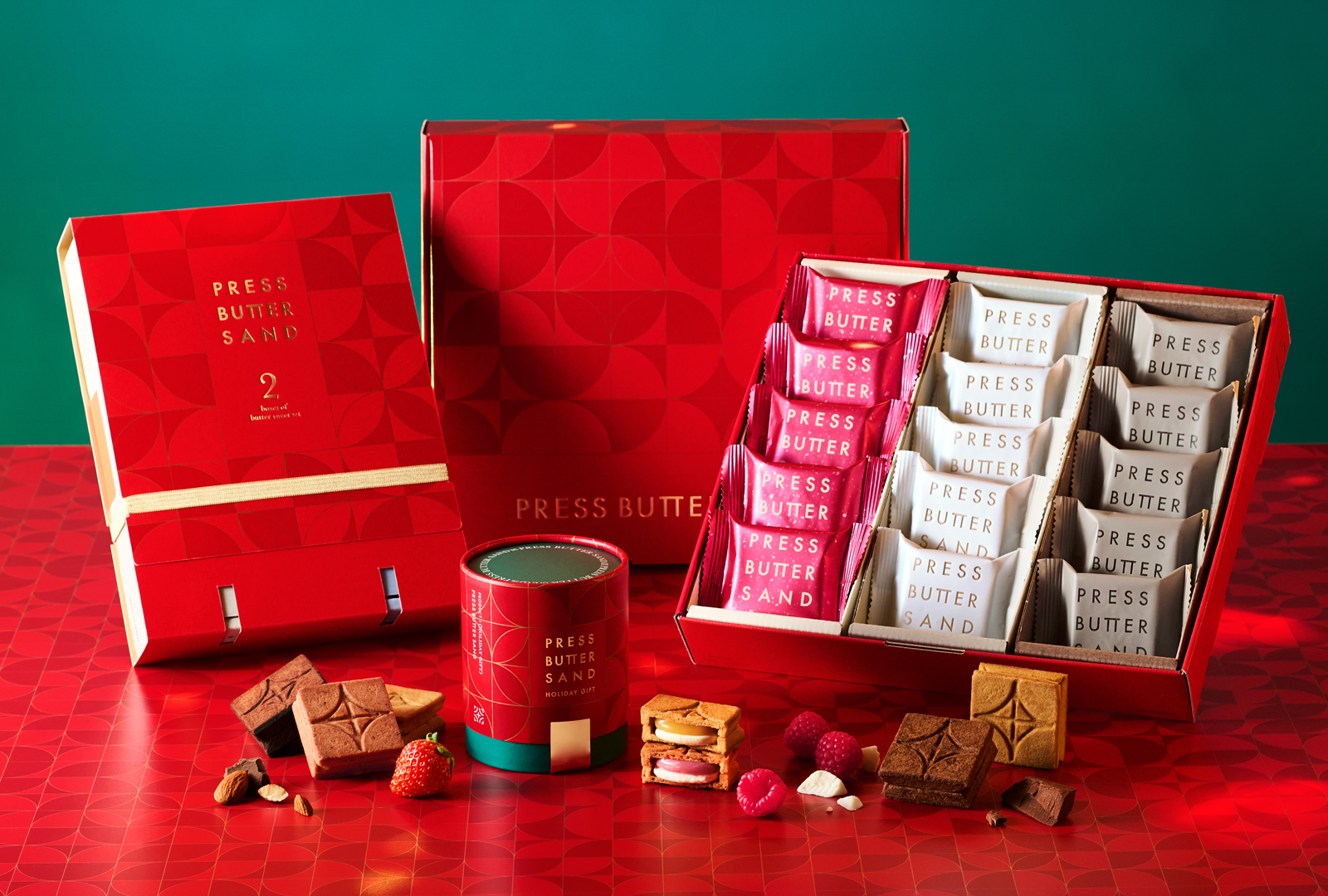 PRESS BUTTER SANDでは、11月1日(土)より順次、冬の特別なシーズンを盛り上げる限定セットをご用意。ホリデーカラーのレッドとグリーンや、華やかに彩るゴールドの限定パッケージでお届けいたします。