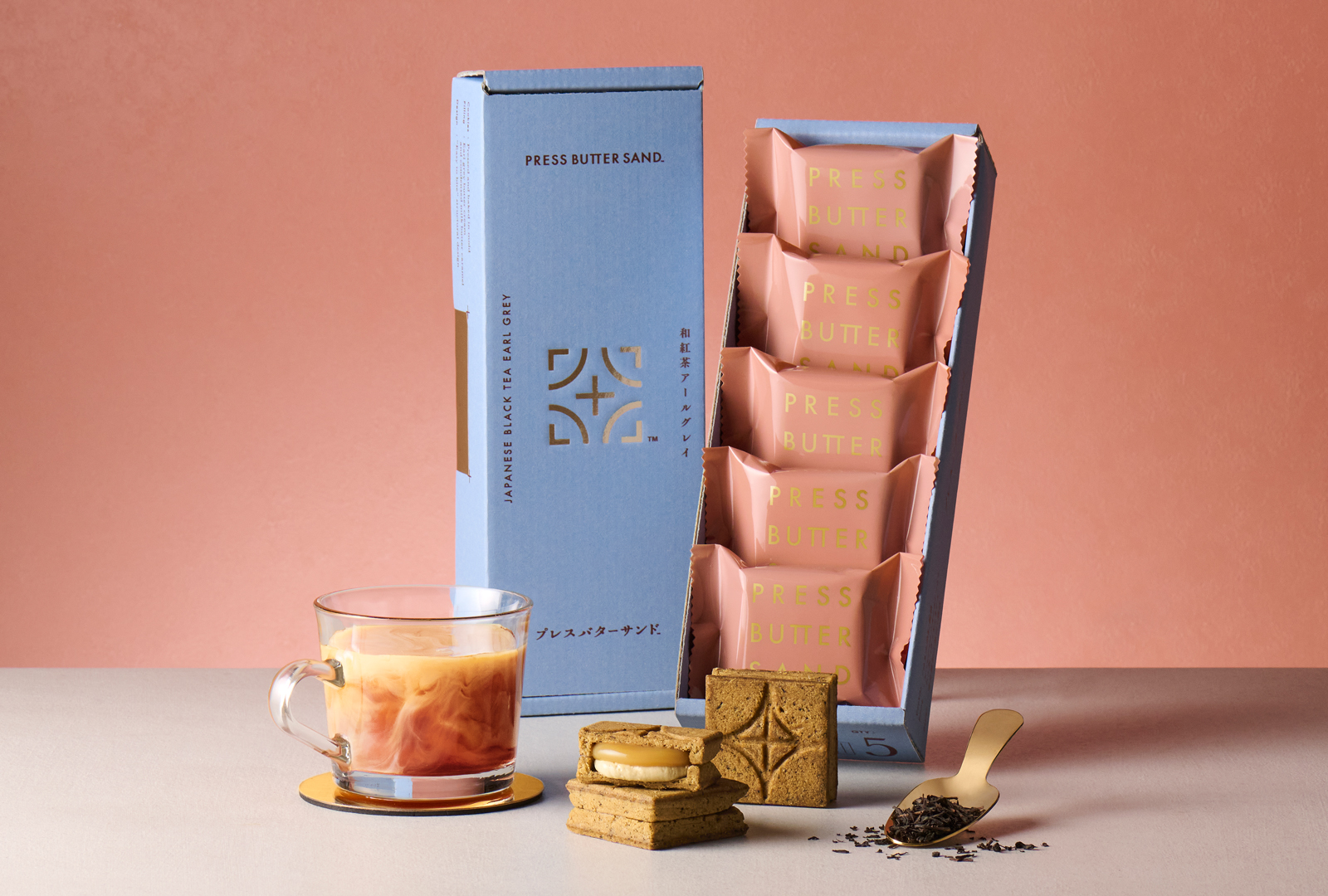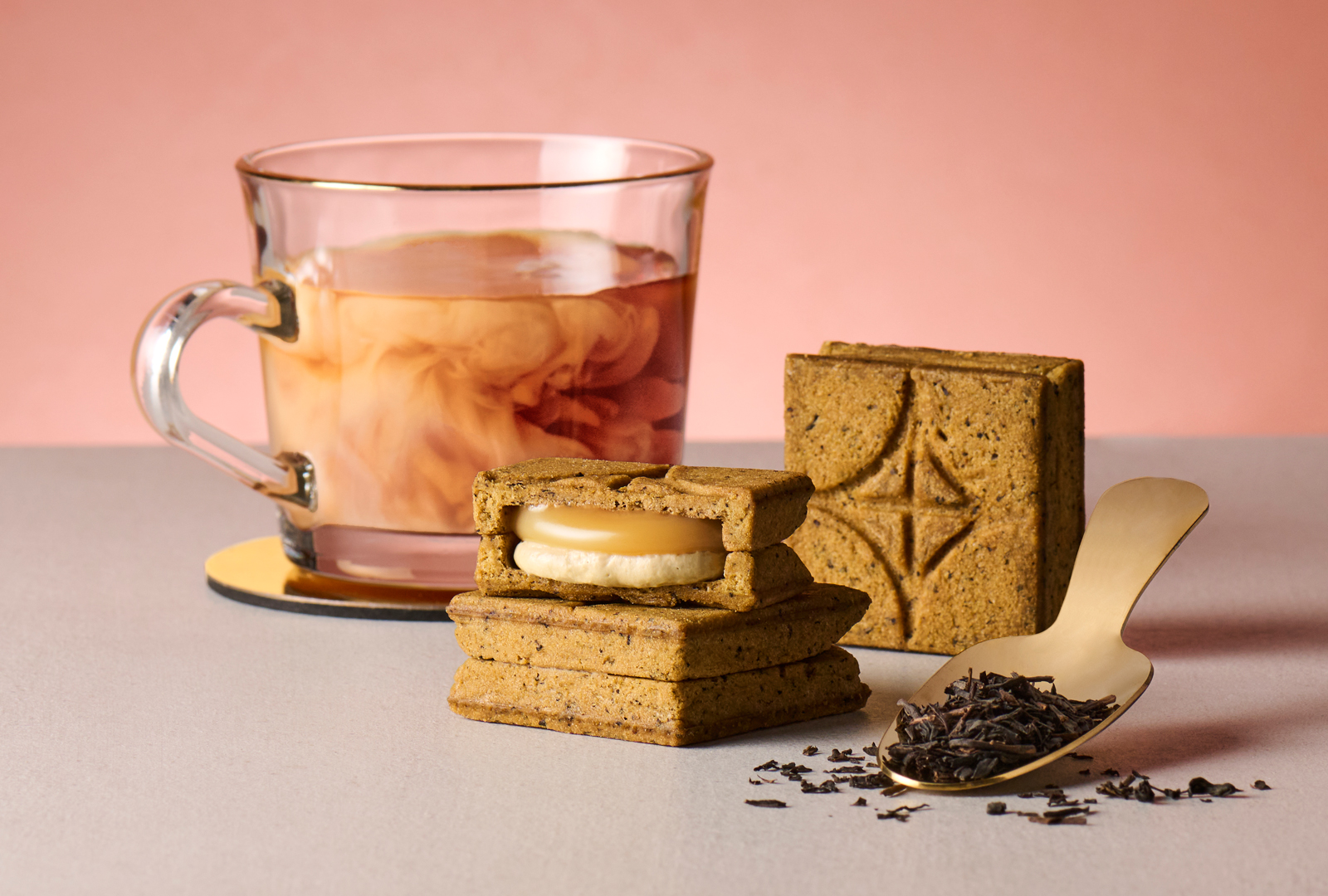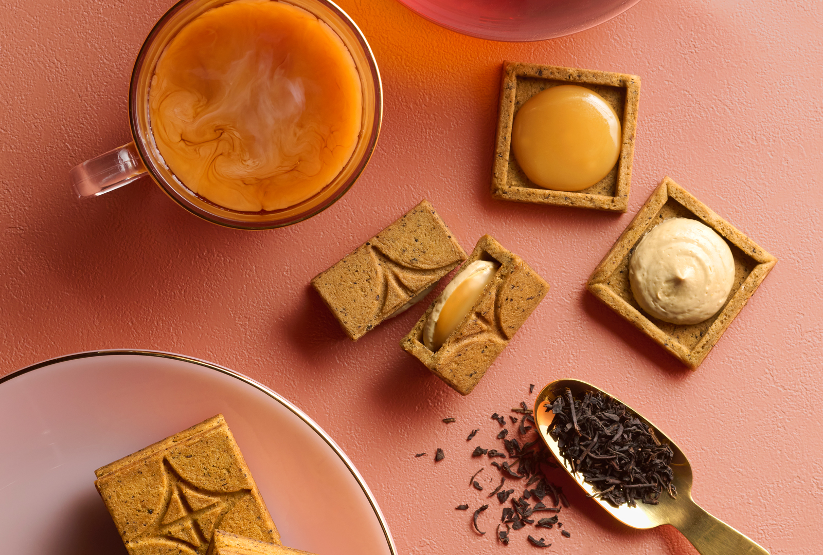 和紅茶とベルガモットオイルを練り込んだアールグレイクッキーに、濃厚でコク深い練乳バターキャラメルがとろけ、まるでミルクティーのようなやさしい甘さが広がります。さらに、バタークリームにも和紅茶とベルガモットオイルを加え、紅茶の芳醇な風味とバターの濃厚なコクが重なり合う一口です。