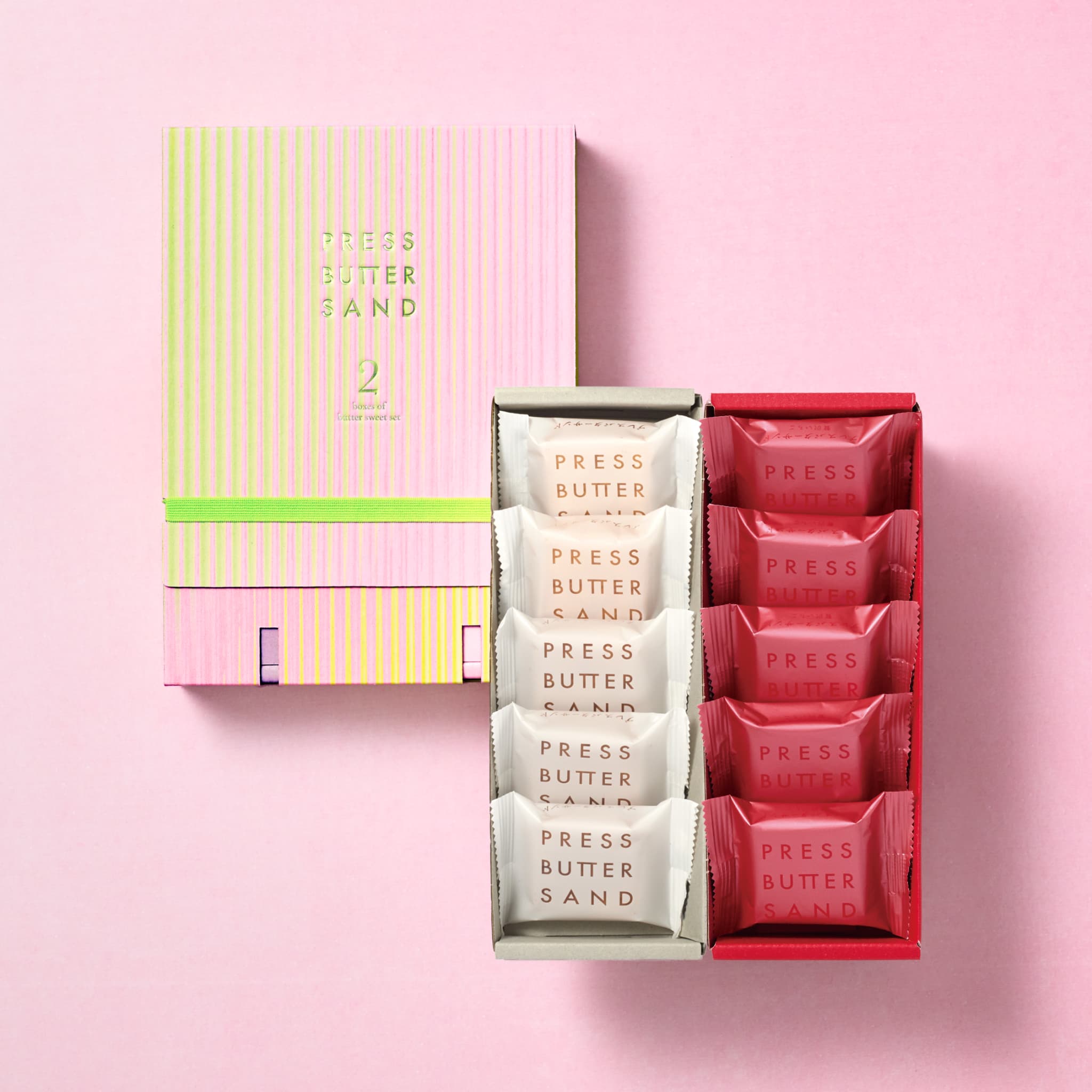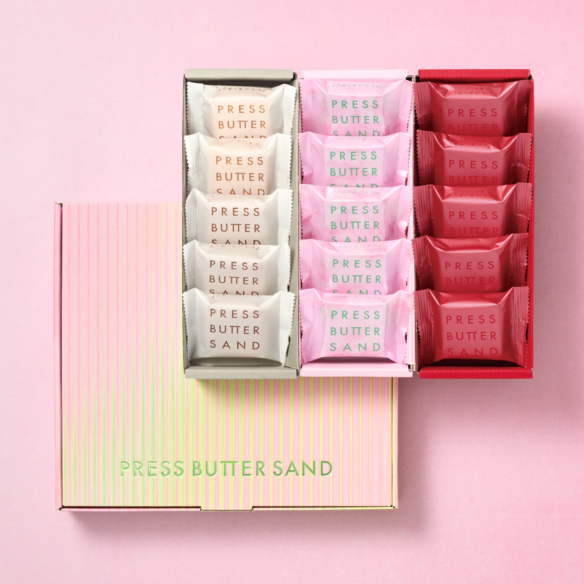 定番の「バターサンド 5個入」に、新フレーバー「バターサンド〈桜〉5個入」と「バターサンド〈贅沢いちご〉5個入」を合わせたセット商品です。